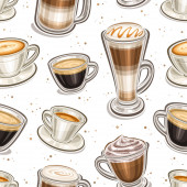 Wektor kawy bezszwowy wzór, kwadratowe powtarzające się tło z zestawem wyciętych ilustracji różnych napojów kawowych w jasnych i porcelanowych filiżanek na białym tle, papier do pakowania dla kawiarni
