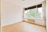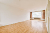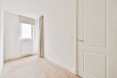 Wąski korytarz z białymi ścianami i drzwiami prowadzącymi do przestronnego pokoju z oknami i parkietem w nowoczesnym apartamencie
