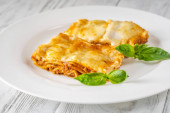 Porcja tradycyjnej włoskiej lazanii na białym talerzu