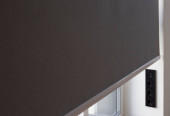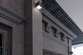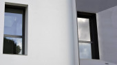 Wlot i wylot powietrza w ścianie domu jednorodzinnego do wentylacji mechanicznej z odzyskiem ciepła, zabezpieczonej metalowym grillem z siatką.