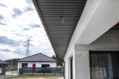 Wlot i wylot powietrza w ścianie domu jednorodzinnego do wentylacji mechanicznej z odzyskiem ciepła, zabezpieczonej metalowym grillem z siatką.