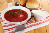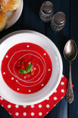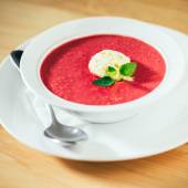 Gazpacho çorbası renkli ahşap zemin üzerinde