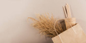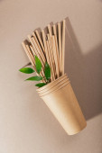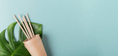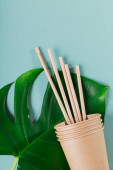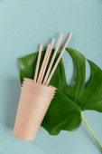 Jednorazowa papierowa zastawa stołowa. Wykonuj papierowe kubki i słomki na jasnoniebieskim tle. Koncepcja wolnego od tworzyw sztucznych i odpadów zerowych.