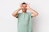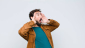 młody szaleniec czuje się zszokowany, zdumiony i zaskoczony, trzymając okulary ze zdumionym, niedowierzającym spojrzeniem