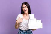 Latynoska ładna kobieta czuje się szczęśliwa, zaskoczona realizacją rozwiązania lub pomysłu z białymi, czystymi pudełkami