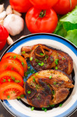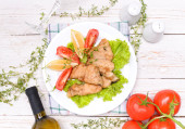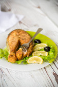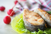 Pieces of fried hake fish in a plate with pepper on a wooden table