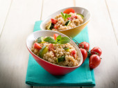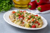 bakłażan smażony z innymi warzywami w talerzu na drewnianym stole