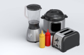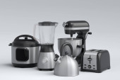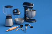 Elektryczne urządzenia kuchenne i naczynia do przygotowywania śniadań na niebieskim tle. 3d renderowanie naczyń kuchennych do gotowania, pieczenia, mieszania i biczowania