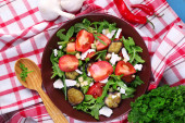 Zdjęcie "Sałatka z bakłażana z pomidory, rukola i feta ser w serwetkę, na tle drewniane kolor" może być wykorzystywane do celów osobistych i komercyjnych zgodnie z warunkami zakupionej licencji Royalty-free. Obraz jest dostępny do pobrania w jakości wysokiej rozdzielczości do 5760x3840.