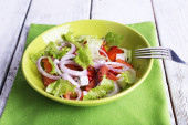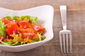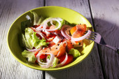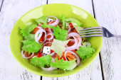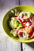 Świeże ryby sałatka z warzyw na talerzu na drewniany stół szczegół