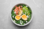 Pyszna sałatka z jajkiem gotowanym, łososiem i awokado w misce na białym drewnianym stole, widok z góry