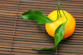 Mandaryna z zielonych liści na drewnianą łyżką na białym tle