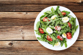Pyszna sałatka z jajkiem gotowanym, pomidorami i serem serwowana na drewnianym stole, płaska nioska. Miejsce na tekst