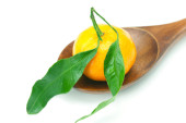 Mandaryna z zielonych liści na drewnianą łyżką na białym tle