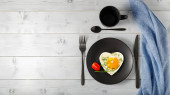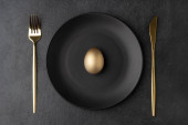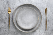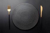 Czarny pusty talerz, matowy złoty nóż i widelec na szarym tle łupkowym. Nakrycie stołu na kolację.