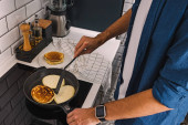 Widok człowieka trzymającego naleśniki i patelnię przy kawie i miodzie w kuchni