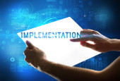 Tylny widok biznesmena z napisem IMPLEMENTATION, koncepcja nowoczesnej technologii