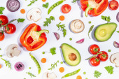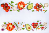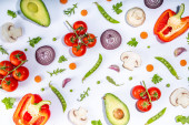 Zdjęcie "Różne świeże warzywa. Surowe warzywa organiczne, składniki sałatkowe jasne płaskowyże na białym tle. Zdrowa dieta wspólna dieta, wegańskie jedzenie wegetariańskie gotowanie tło przestrzeń kopia" może być wykorzystywane do celów osobistych i komercyjnych zgodnie z warunkami zakupionej licencji Royalty-free. Obraz jest dostępny do pobrania w jakości wysokiej rozdzielczości do 5760x3840.