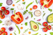 Różne świeże warzywa. Surowe warzywa organiczne, składniki sałatkowe jasne płaskowyże na białym tle. Zdrowa dieta wspólna dieta, wegańskie jedzenie wegetariańskie gotowanie tło przestrzeń kopia