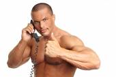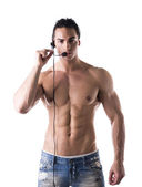 Muskularny mężczyzna przystojny za pomocą golarka elektryczna, patrząc od