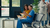 Starszy lekarz wyjaśniający diagnostykę rentgenowską pacjentom w poczekalni, robiącym konsultacje kontrolne. Pokazuję wyniki badań radiologicznych na egzaminie kontrolnym. Strzał statywu.
