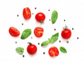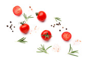 Skład ze świeżymi pomidorami i przyprawami na białym tle