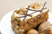 kawałek ciasta z orzechami i łyżka leżący na talerzu