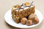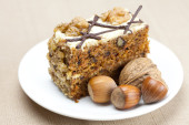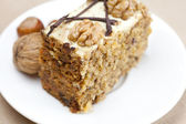 kawałek ciasta z orzechami i łyżka leżący na talerzu