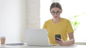 Młoda kobieta reaguje na utratę podczas korzystania z laptopa