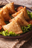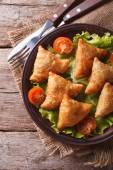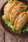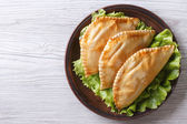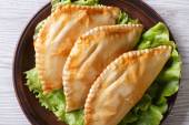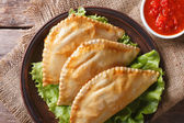 Tradycyjne empanadas i sos zbliżenie. pionowe widok z góry