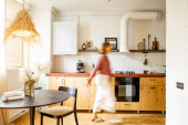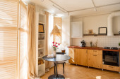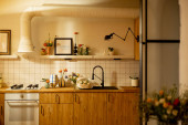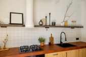 Zdjęcie "Fragment wnętrza kuchni w odcieniach bieli i beżu z naturalnych materiałów. Otwarte półki z dekoracją nad blatem kuchennym" może być wykorzystywane do celów osobistych i komercyjnych zgodnie z warunkami zakupionej licencji Royalty-free. Obraz jest dostępny do pobrania w jakości wysokiej rozdzielczości do 5760x3840.