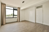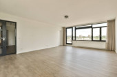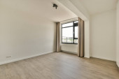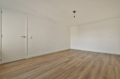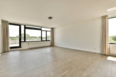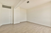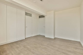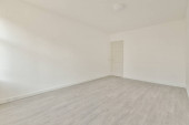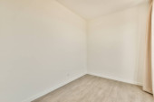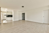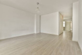 Wnętrze pustego nowoczesnego mieszkania z białymi ścianami i podłogą parkietową oświetloną lampą