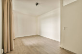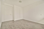Wnętrze pustego nowoczesnego mieszkania z białymi ścianami i podłogą parkietową oświetloną lampą