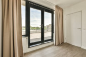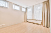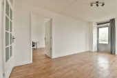 Wnętrze pustego nowoczesnego mieszkania z białymi ścianami i podłogą parkietową oświetloną lampą