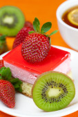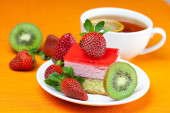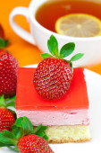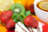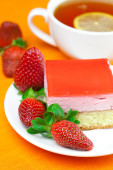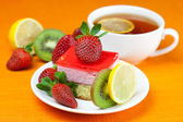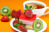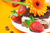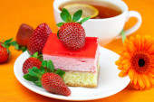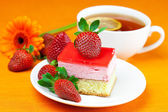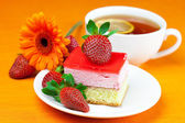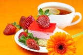 Gerbera, cytryna herbata, ciastko i truskawki leżącego na pomarańczowy fa