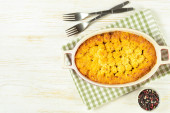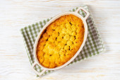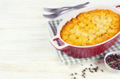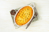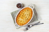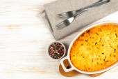 Ciasto pasterskie albo ciasto wiejskie. Mięso mielone, tłuczone ziemniaki i warzywa zapiekanka na białym drewnianym tle z miejsca na tekst. Tradycyjne brytyjskie, Zjednoczone Królestwo, kuchnia irlandzka