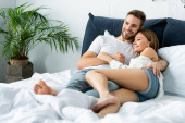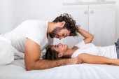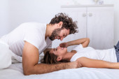 Zdjęcie "Piękna młoda para w domu. Przytulanie, całowanie i cieszenie się razem spędzonym czasem. pełna pasji piękna para w sypialni korzystających z gry wstępnej" może być wykorzystywane do celów osobistych i komercyjnych zgodnie z warunkami zakupionej licencji Royalty-free. Obraz jest dostępny do pobrania w jakości wysokiej rozdzielczości do 5760x3840.