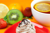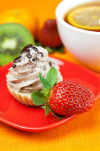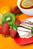 cytryna herbata, kiwi, ciasto i truskawki leżącego na pomarańczowym tkaniny