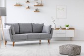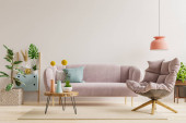 Wnętrze nowoczesnego salonu z roślinami, sofą i fotelami