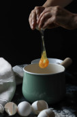 młoda dziewczyna w kuchni łamie jajka i posypuje mąkę do pieczenia fajnego tortu urodzinowego. Koncepcja gotowania w kuchni