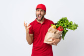 Młoda dostawca bierze worek jedzenia na wynos izolowane na białym tle wskazując na bok, aby przedstawić produkt