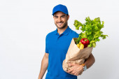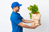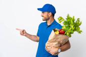 Zdjęcie "Młoda dostawca bierze worek jedzenia na wynos izolowane na białym tle wskazując na bok, aby przedstawić produkt" może być wykorzystywane do celów osobistych i komercyjnych zgodnie z warunkami zakupionej licencji Royalty-free. Obraz jest dostępny do pobrania w jakości wysokiej rozdzielczości do 5760x3840.
