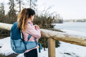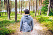 Dziewczyna jest zaangażowana w spacery, wędrówki po wiosennym lesie. Zajęcia fitness i plenerowe. Zdrowy styl życia.