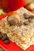 ciasto na talerz, orzechy i filiżankę kawy na maty wiklinowe