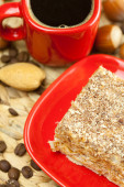 ciasto na talerz, orzechy i filiżankę kawy na maty wiklinowe