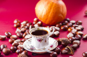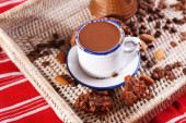ciasto na talerz, orzechy i filiżankę kawy na maty wiklinowe