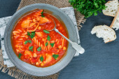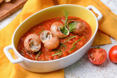 Zdjęcie "Duszony gulasz z ośmiornicy w stylu włoskim lub greckim z sosem pomidorowym, czosnkiem i oliwkami. Polipetti affogati alla Luciana" może być wykorzystywane do celów osobistych i komercyjnych zgodnie z warunkami zakupionej licencji Royalty-free. Obraz jest dostępny do pobrania w jakości wysokiej rozdzielczości do 5760x3840.