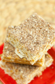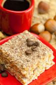 ciasto na talerz, orzechy i filiżankę kawy na maty wiklinowe