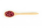 Tabletki leku na drewnianą łyżką na białym tle