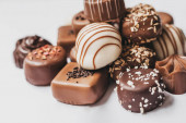 Asortyment ciemnej, białej i mlecznej czekolady izolowane na białym tle. Trufle, cukierki z dekoracją. Różne cukierki. Widok z góry